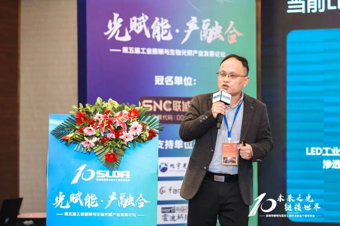 深圳市照明与显示工程行业协会总工程师景发俊以《点亮智慧工业之光,把握光合新纪元》为题进行分享。他指出,在“双碳”与数字化转型背景下,LED技术正赋能工业与农业双业升级。工业照明已实现从功能照明到智能生态的跨越,通过大功率化、智能融合突破,在多场景实现高效节能与安全预警;LED植物照明则以光配方革命重塑生产范式,推动作物产量与品质双升。他强调行业需政策与市场双轮驱动,未来将呈现技术融合、绿色低碳等趋势,倡议产业链协同创新、完善标准体系,协会也将通过多项行动共建产业新生态。