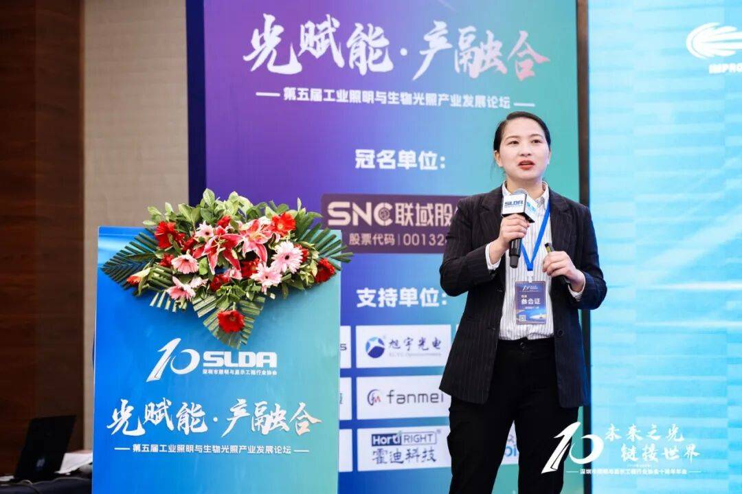 东莞市立德达光电科技有限公司技术副总陈小燕以《技术立身 品牌成型 筑梦远航》为题进行分享。他指出,立德达以技术创新为核心竞争力,深耕光谱技术研发,产品覆盖260-1650nm全波段,推出“立德生物光”等创新系列,在植物照明、美健个护等领域实现差异化突破。并依托产学研协同与专利布局,搭建专业光谱实验室,主导多项行业标准制定。同时践行“三品合一”理念,通过全球销售网络拓展市场,以技术赋能产业、以品牌凝聚价值,为中小企业在产业融合中实现高质量发展提供实践路径。