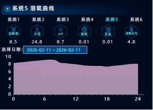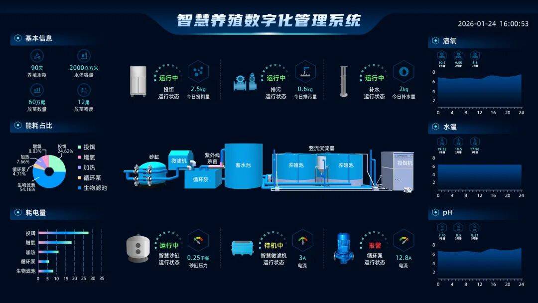 帮邦智慧水质调节技术,构建了 “实时监测 - 智能分析 - 自动调控 - 闭环验证” 的全流程 AI 管控体系 。系统通过在线 小时实时监测溶解氧、pH、氨氮、亚硝酸盐、水温等核心水质参数,数据同步上传至中央控制平台,一旦指标偏离设定阈值,系统会自动启动对应的调控设备。例如,pH 值偏离 7.5-8.5 区间时,自动控制 pH 调节液的添加量,精准维持水体酸碱度;氨氮、亚硝酸盐超标时,自动调整循环速率与生物滤池曝气强度,强化硝化降解能力;同时支持定量自动补水、定时补水,自动统计日补水量,全程无需人工干预,就能将核心水质参数稳定在鱼类生长的最佳区间,从源头降低病害发生风险,为无抗养殖奠定基础。